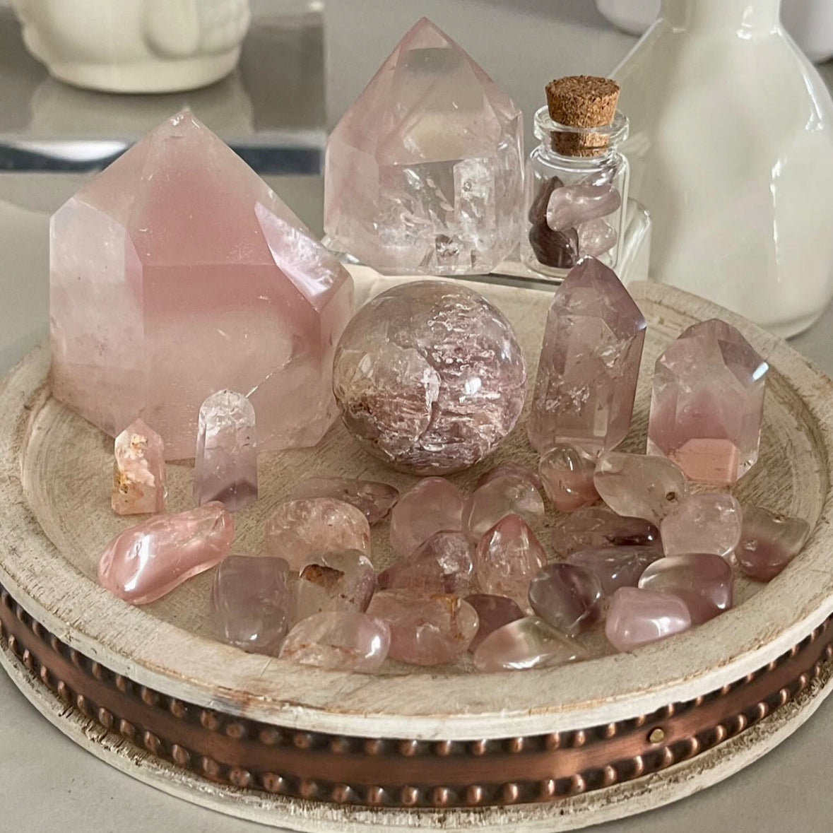 Our crystals are ethically sourced and include high-grade flower agate, calming pink lithium, rare Caribbean calcite, and ocean jasper—all handpicked for their beauty and energy. Many are one-of-a-kind pieces, chosen to make a statement and aid in your healing.