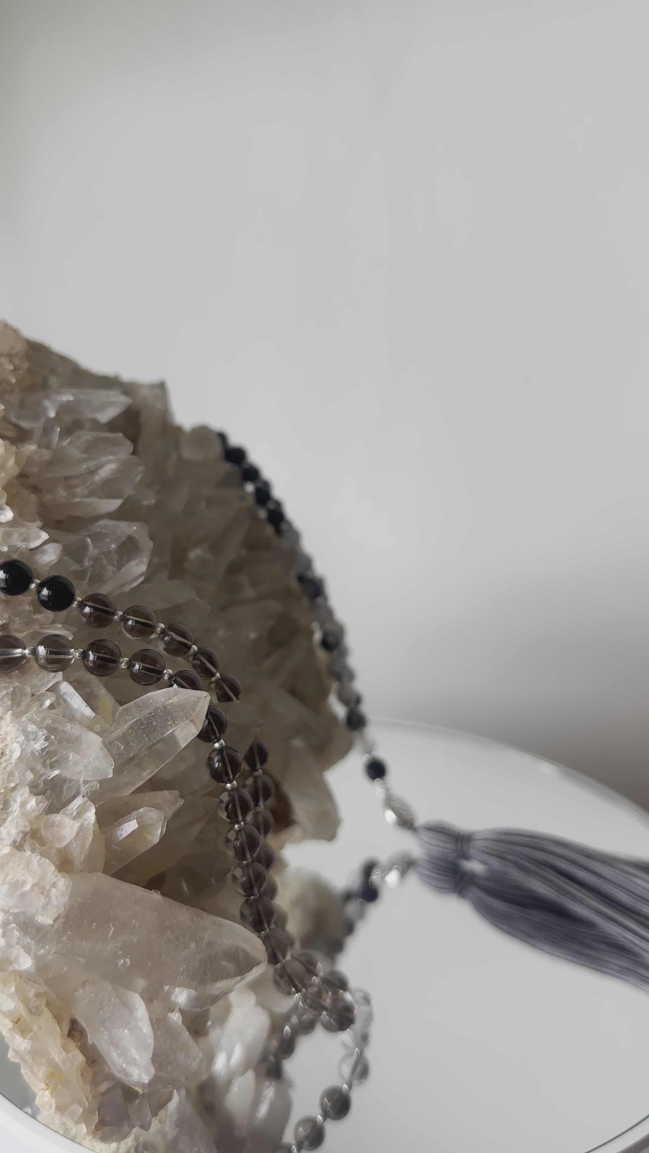 At the heart of the mala lies a Silver Tree of Life Guru Bead, symbolising wisdom, growth, and interconnectedness. The piece is completed with Sterling Silver spacers and a beautifully hand-tied tassel in black, grey, and white, representing balance, clarity, and protection.